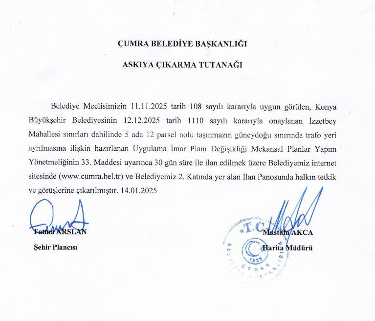 İzzetbey Mahallesi Sınırları Dahilinde 5 Ada 12 Parsel Nolu Taşınmazın Güneydoğu Sınırında Trafo Yeri Ayrılmasına İlişkin Hazırlanan Uygulama İmar Planı Değişikliği